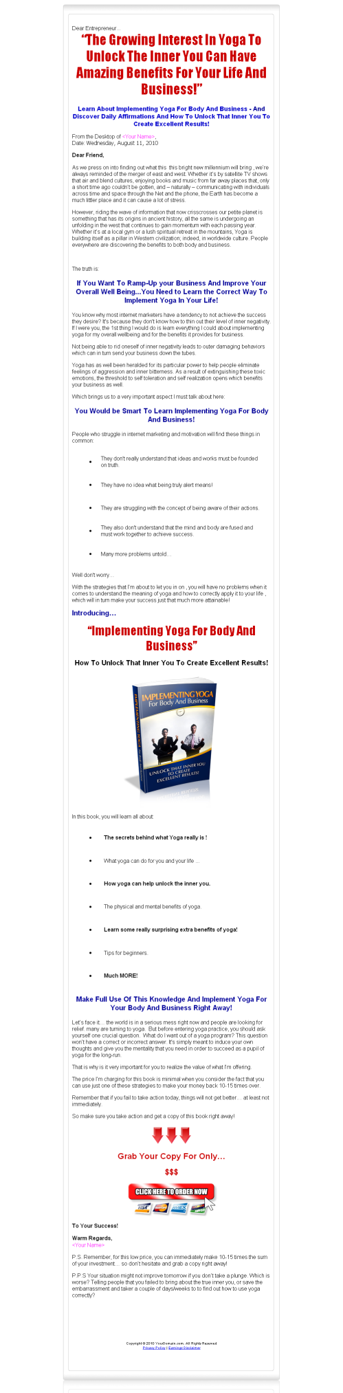 Yoga has as well been heralded for its particular power to help people eliminate feelings of aggression and inner bitterness. As a result of extinguishing these toxic emotions, the threshold to self toleration and self realization opens which benefits your business as well.